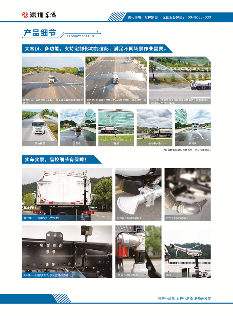 由深圳东风十堰智能工厂生产制造,是一款集路面保洁、园林绿化、除霾消杀、运水供水、应急抢险、工地降尘、路基补水等多功能作业于一体的城市美化车辆。该车采用东风华神底盘、自主生产罐体总成,匹配高端焊装、涂装等智能化设备。得益于深圳东风40多年环卫装备制造经验,具备过硬品质、优渥性能,满足不同场景作业需要,深受广大客户青睐。